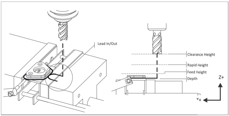 اگرچه واژهشناسی و روش کارها، به طور گستردهای متفاوت است، اما تمام نرمافزارهای CAD/CAM به اطلاعات اساسی مشابهی برای عملکرد نیاز دارند. شکل 4 پارامترهای معمول برای مسیرابزارهای دوبعدی را نشان میدهد.