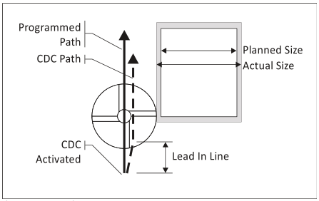 طبق شکل 5، CDC در انتهای خطی که فراخوانده میشود، فعال میشود. توجه کنید که ابزار، چگونه از ابتدا تا انتهای خط ورود هادی، در یک زاویه حرکت میکند. CDC را در حالی که ابزار از قطعه دور است فعال کنید تا این حرکت زاویه دار، دور از سطوح صیقل یافته قطعه انجام شود. حرکتهای خطی-قوسی که در شکل 4 نشان داده شده است، پاکسازی کاملی برای ابزار این هدف فراهم میکنند.