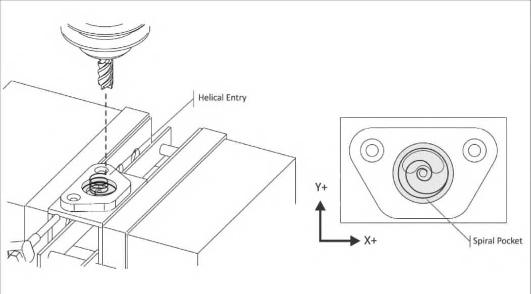 - حرکات مارپیچی، روش خوبی برای ورود به محفظه هستند. اگر فضا، امکان حرکت مارپیچی را سلب کرد، از یک فرز انتهایی برش مرکزی استفاده کنید یا ابزار را از طریق سوراخ موجود یا یک سوراخ هادی ایجادشده برای این منظور نفوذ دهید. قطر سوراخ هادی باید حداقل به اندازه نصف ابزار باشد.